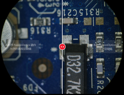 (注:圖像模擬,所示為通過目鏡觀察到的具有和不具有 FusionOptics 融合光學(xué)效果的印刷電路板樣品。)