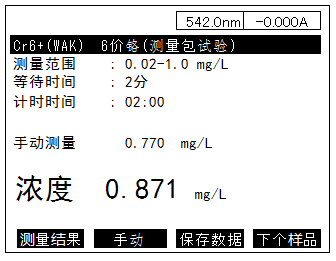 等待時(shí)間之后進(jìn)行自動(dòng)測量。界面顯示計(jì)時(shí)時(shí)間,等待時(shí)間之后自動(dòng)顯示濃度值,通過蜂鳴通知測量結(jié)束